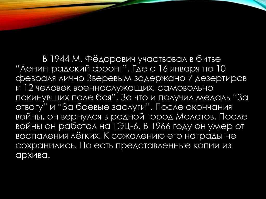 В 1944 М. Фёдорович участвовал в битве“Ленинградский фронт”. Где с 16 января по 10