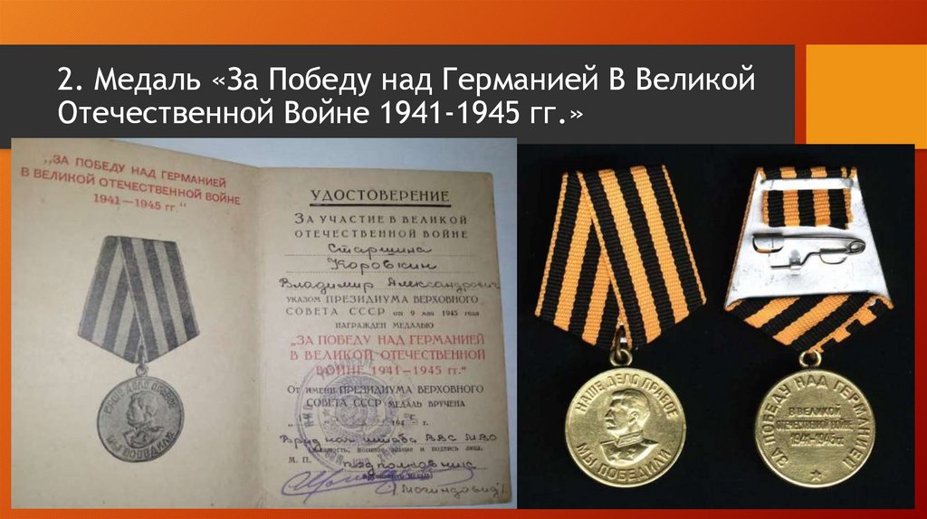 2. Медаль «За Победу над Германией В ВеликойОтечественной Войне 1941-1945 гг.»