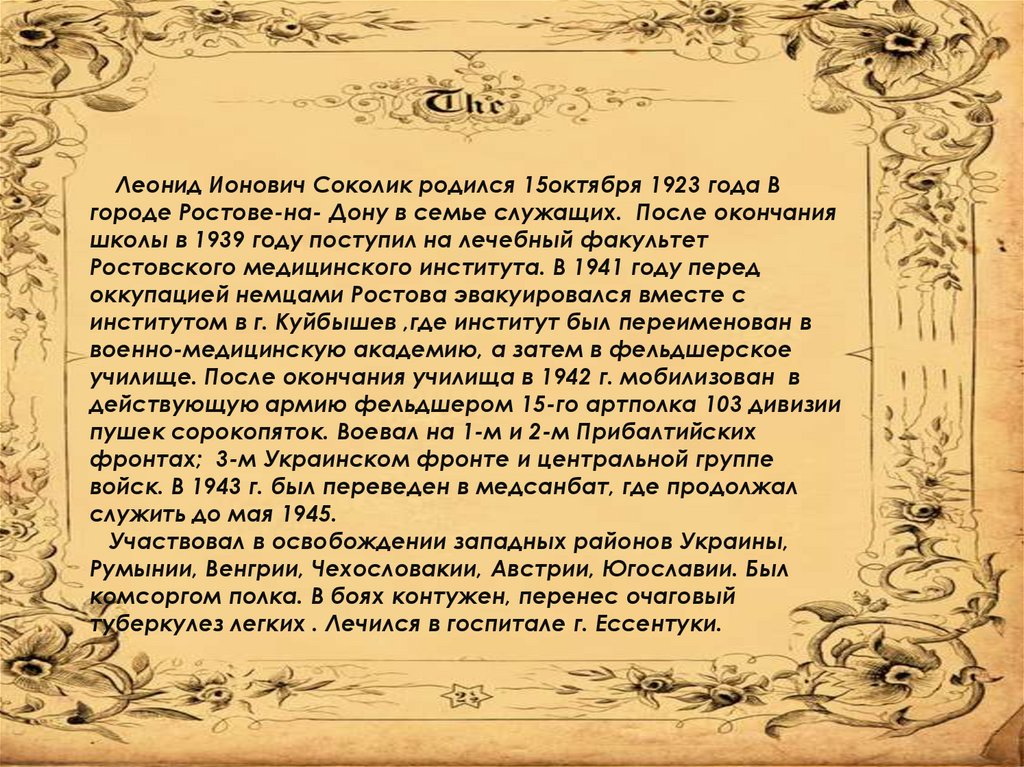 Леонид Ионович Соколик родился 15октября 1923 года Вгороде Ростове-на- Дону в семье служащих. После окончания