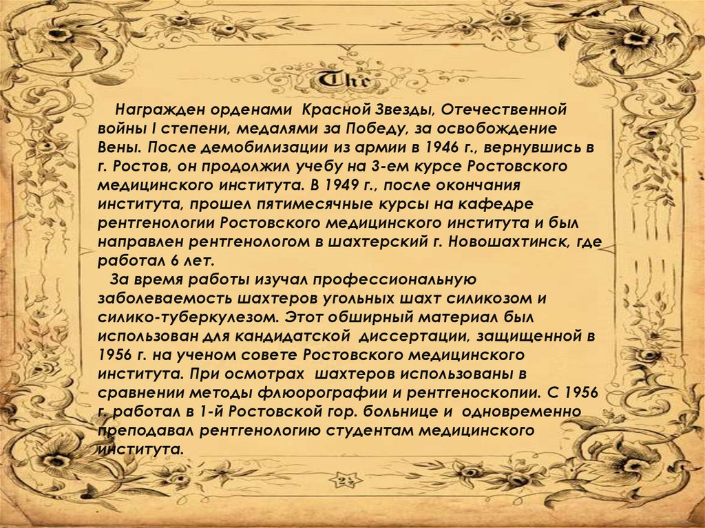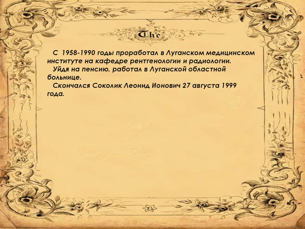 С 1958-1990 годы проработал в Луганском медицинскоминституте на кафедре рентгенологии и радиологии.