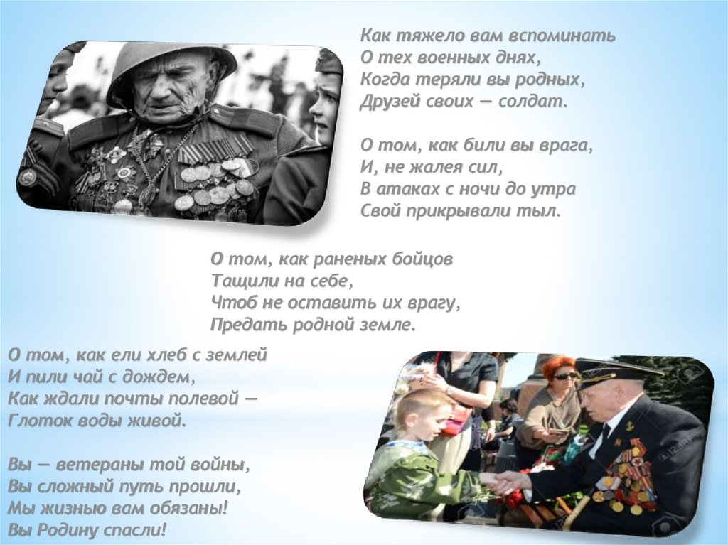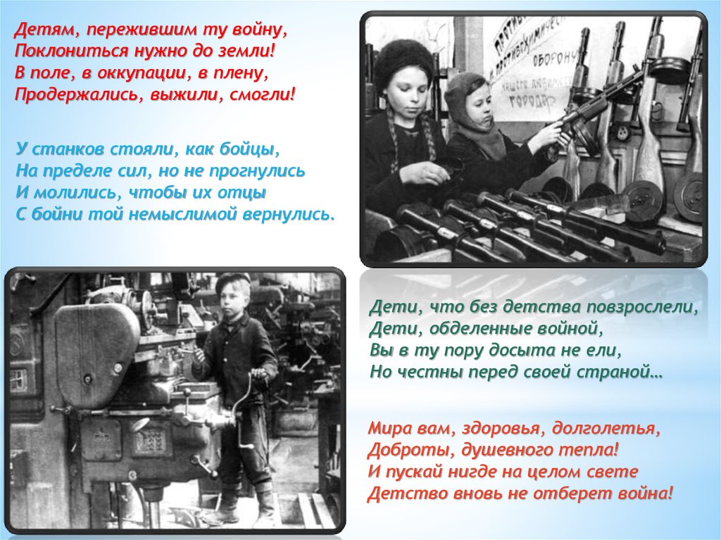 Детям, пережившим ту войну,Поклониться нужно до земли!