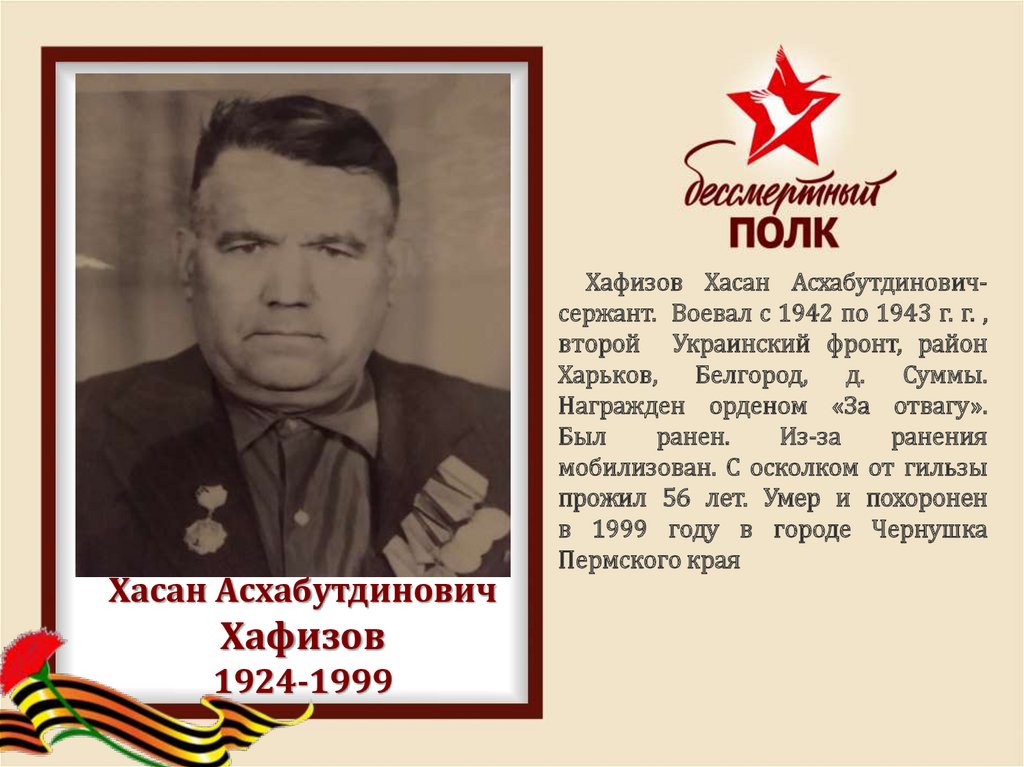 Хафизов Хасан Асхабутдиновичсержант. Воевал с 1942 по 1943 г. г. ,второй Украинский фронт, район