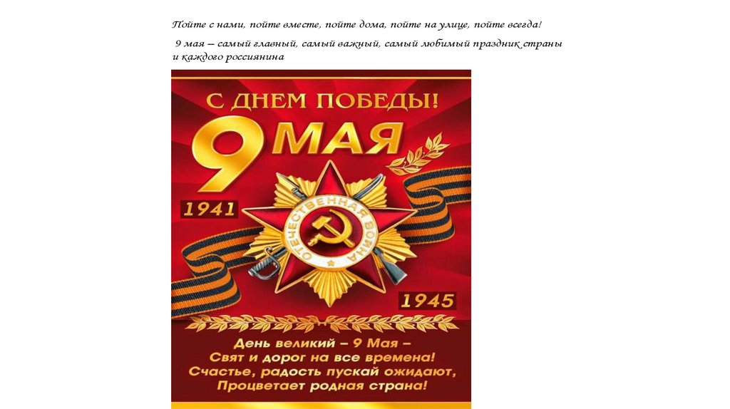 Пойте с нами, пойте вместе, пойте дома, пойте на улице, пойте всегда!9 мая – самый главный, самый важный, самый любимый праздник страны