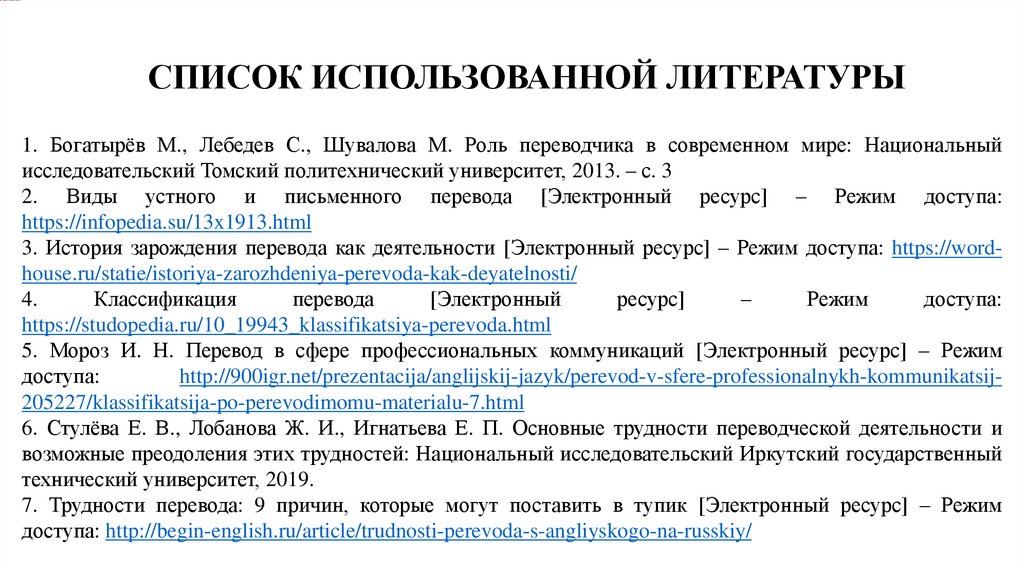 СПИСОК ИСПОЛЬЗОВАННОЙ ЛИТЕРАТУРЫ1. Богатырёв М., Лебедев С., Шувалова М. Роль переводчика в современном мире: Национальный