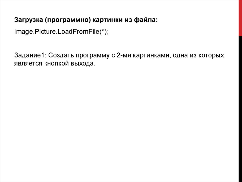Загрузка (программно) картинки из файла:Image.Picture.LoadFromFile(‘’);