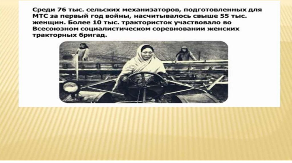 7. Тракторист П. Ангелина призывала девушек: «Овладевайте трактором», в июне 1941 г. свыше 26 тыс. девушек стали трактористами.