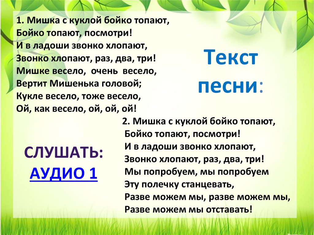 1. Мишка с куклой бойко топают,Бойко топают, посмотри!
