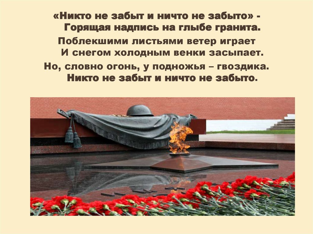 «Никто не забыт и ничто не забыто» Горящая надпись на глыбе гранита.