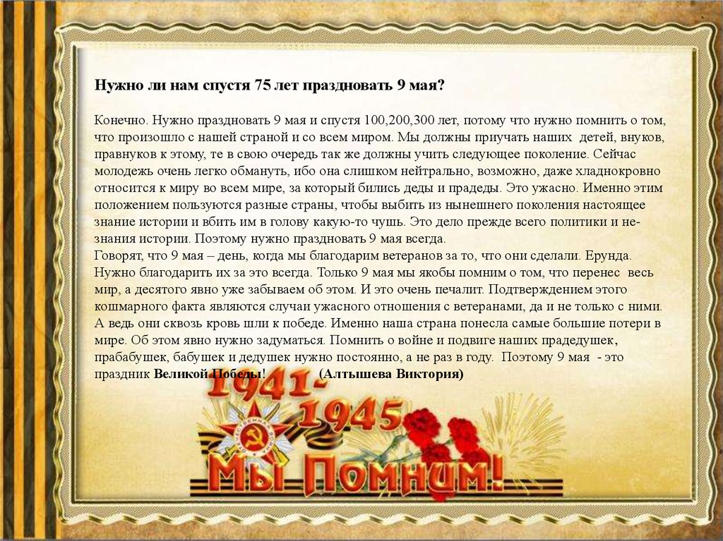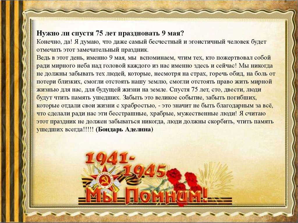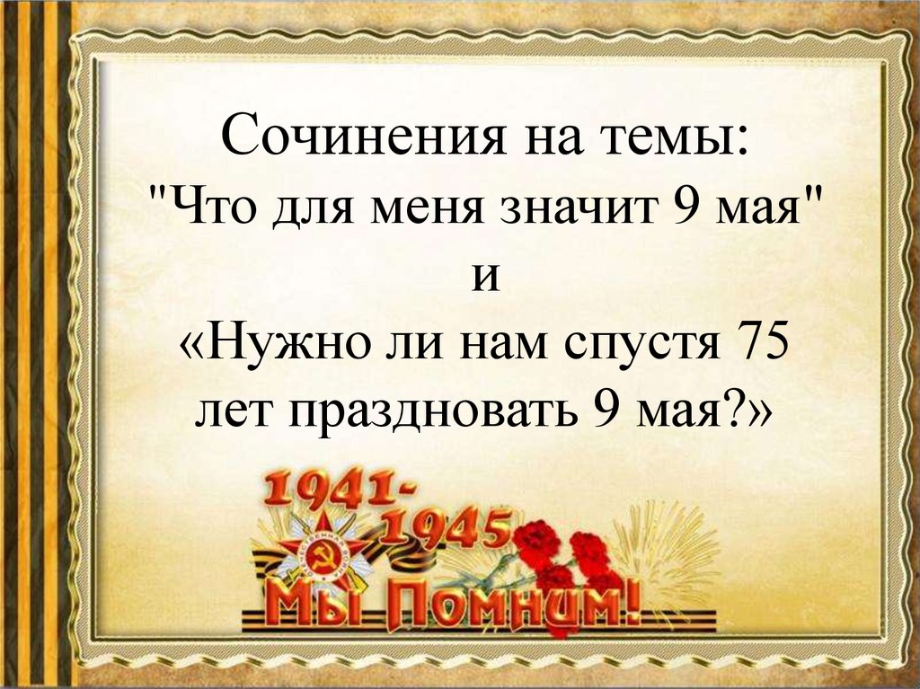 Сочинения на темы: «Что для меня значит 9 мая» и «Нужно ли нам спустя 75 лет праздновать 9 мая?»