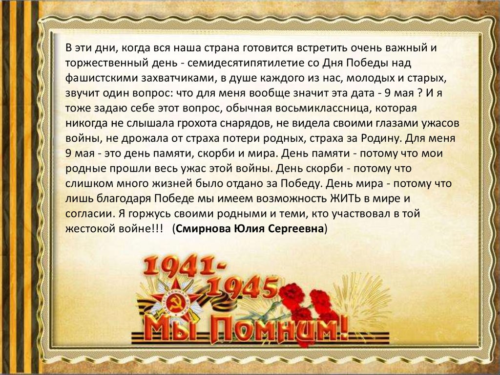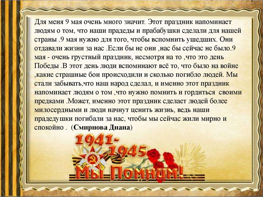 Для меня 9 мая - это день памяти , скорби и мира .День памяти , потому что мы вспоминаем тех, кто с честью прошёл эту