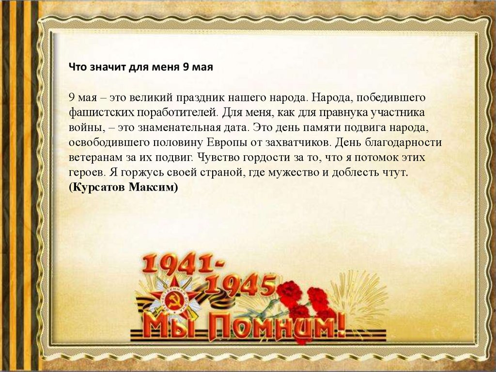 Что значит для меня 9 мая9 мая – это великий праздник нашего народа. Народа, победившего