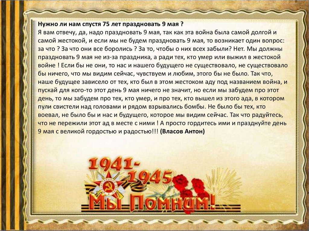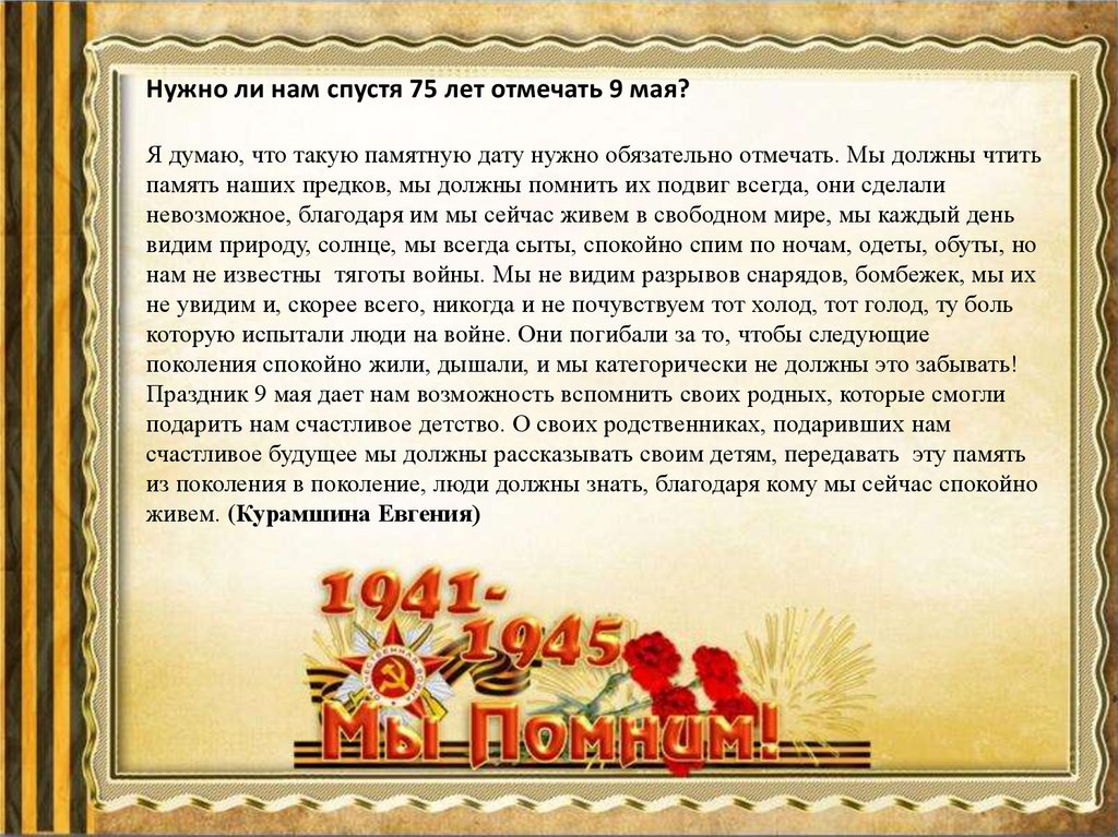 Нужно ли нам спустя 75 лет отмечать 9 мая?Я думаю, что такую памятную дату нужно обязательно отмечать. Мы должны чтить