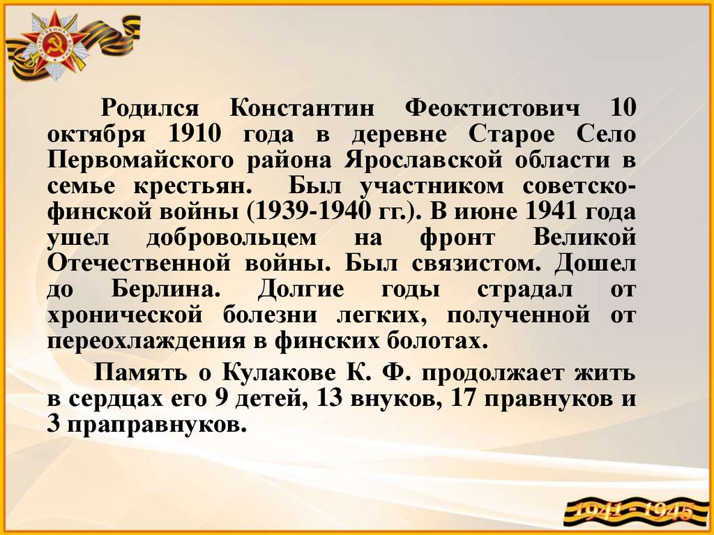 Родился Константин Феоктистович 10октября 1910 года в деревне Старое Село