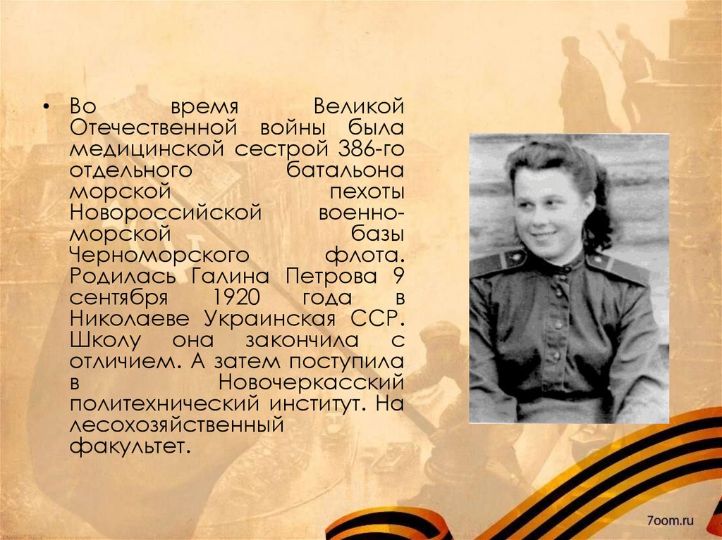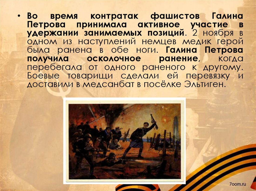 • Во время контратак фашистов ГалинаПетрова принимала активное участие в