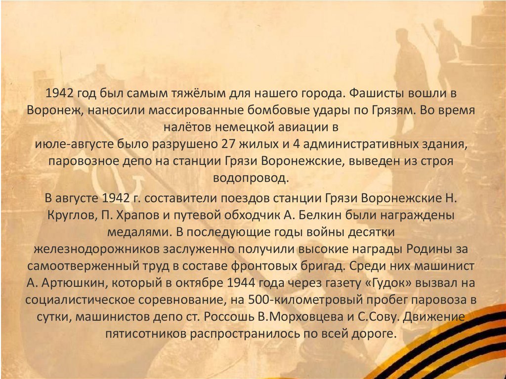 1942 год был самым тяжёлым для нашего города. Фашисты вошли вВоронеж, наносили массированные бомбовые удары по Грязям. Во время