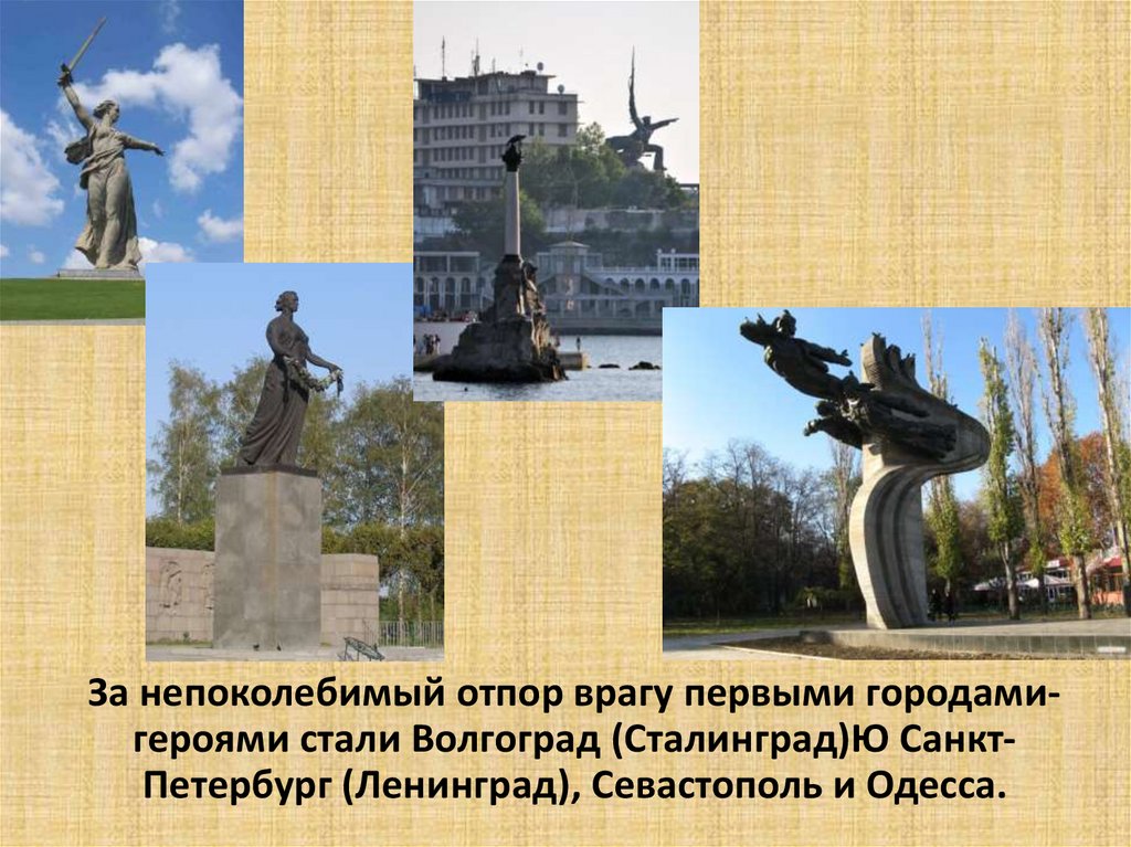За непоколебимый отпор врагу первыми городамигероями стали Волгоград (Сталинград)Ю СанктПетербург (Ленинград), Севастополь и Одесса.5.