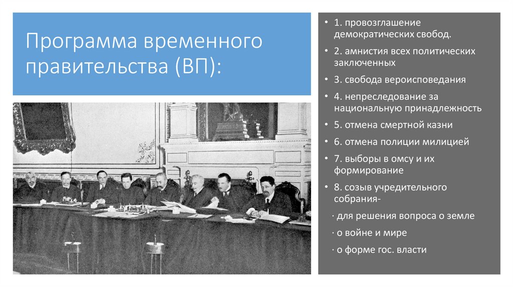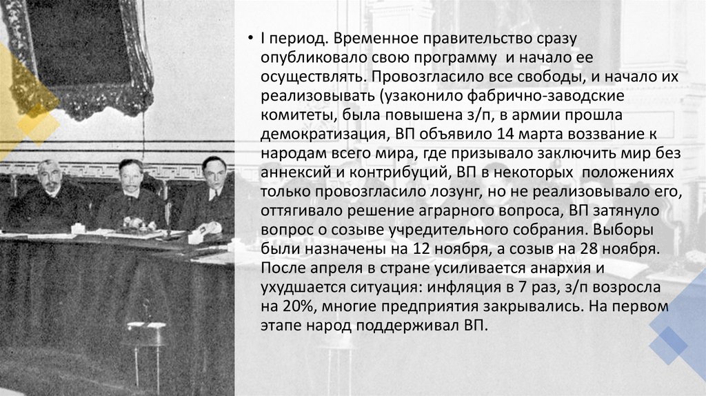 • I период. Временное правительство сразуопубликовало свою программу и начало ее