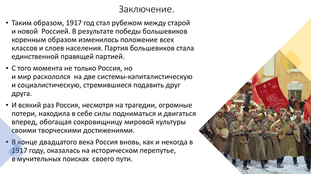 • Таким образом, 1917 год стал рубежом между старойи новой Россией. В результате победы большевиков