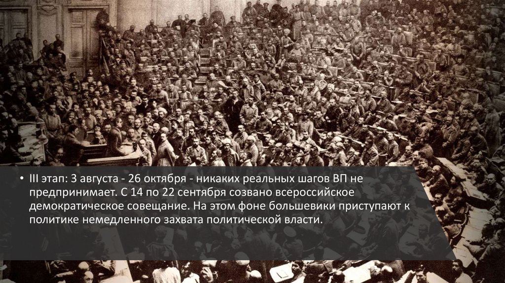 • III этап: 3 августа - 26 октября - никаких реальных шагов ВП непредпринимает. С 14 по 22 сентября созвано всероссийское