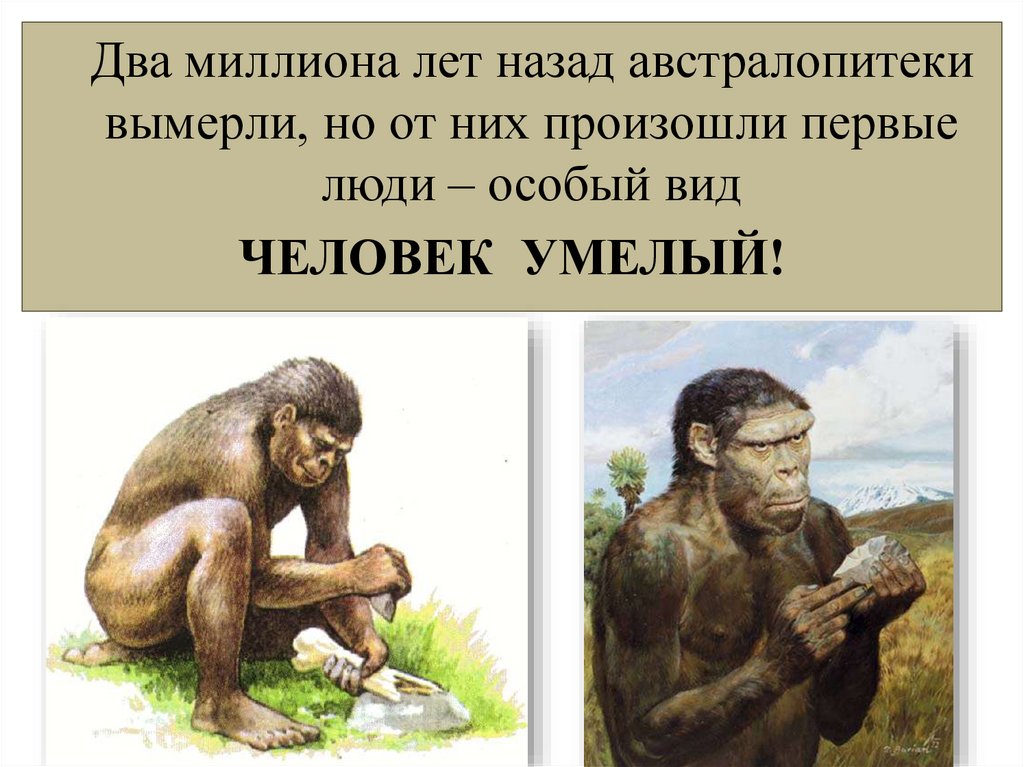 Два миллиона лет назад австралопитекивымерли, но от них произошли первые