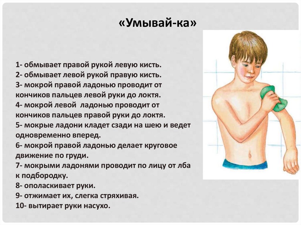 «Умывай-ка»1- обмывает правой рукой левую кисть.