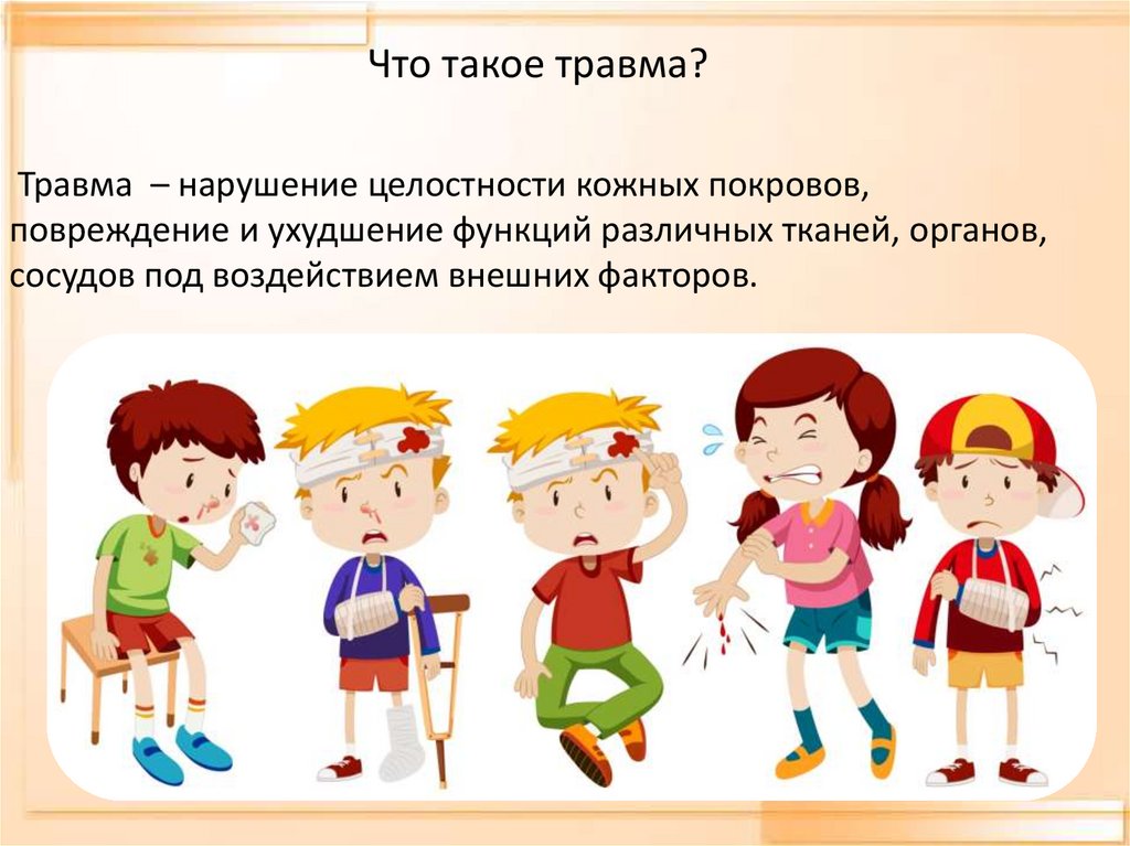 Что такое травма?Травма – нарушение целостности кожных покровов,