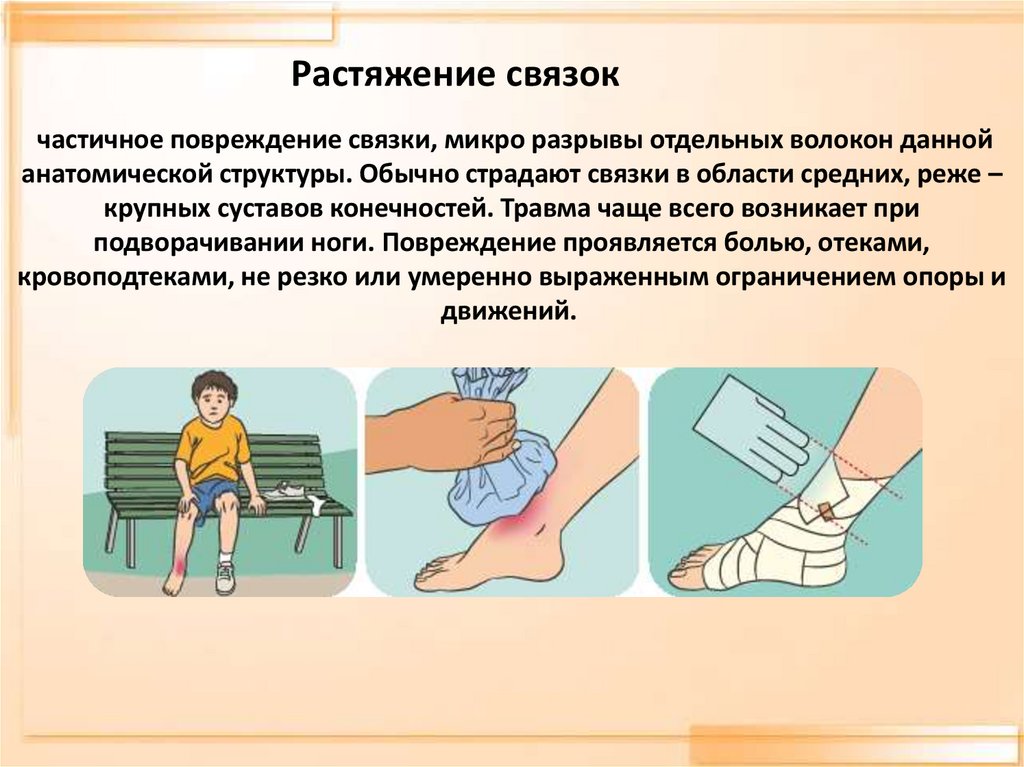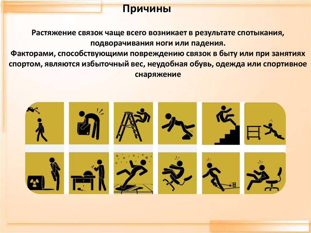 ПричиныРастяжение связок чаще всего возникает в результате спотыкания,