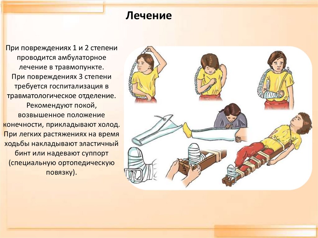 ЛечениеФиксация повреждённой конечности косынкой, шиной и др.Холод на область