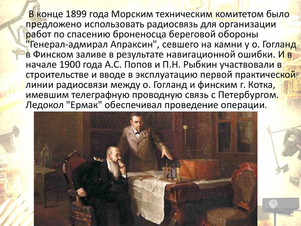 В конце 1899 года Морским техническим комитетом былопредложено использовать радиосвязь для организации