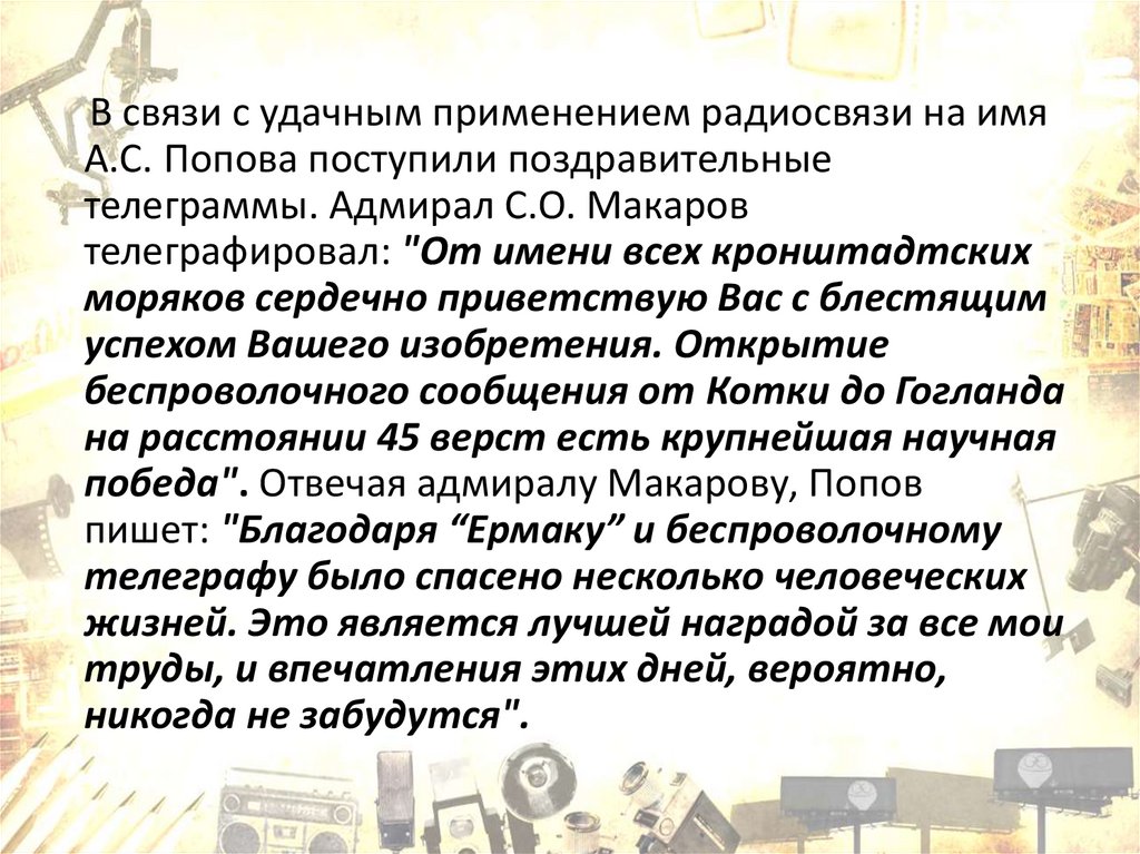 В связи с удачным применением радиосвязи на имяА.С. Попова поступили поздравительные