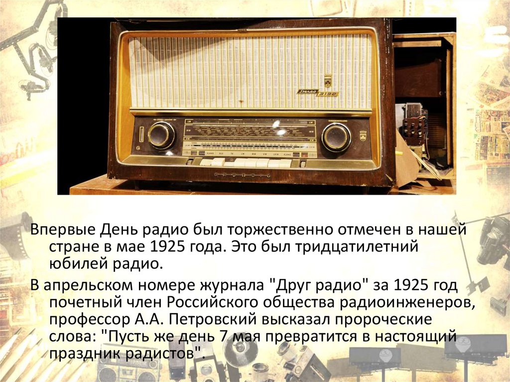 Впервые День радио был торжественно отмечен в нашейстране в мае 1925 года. Это был тридцатилетний