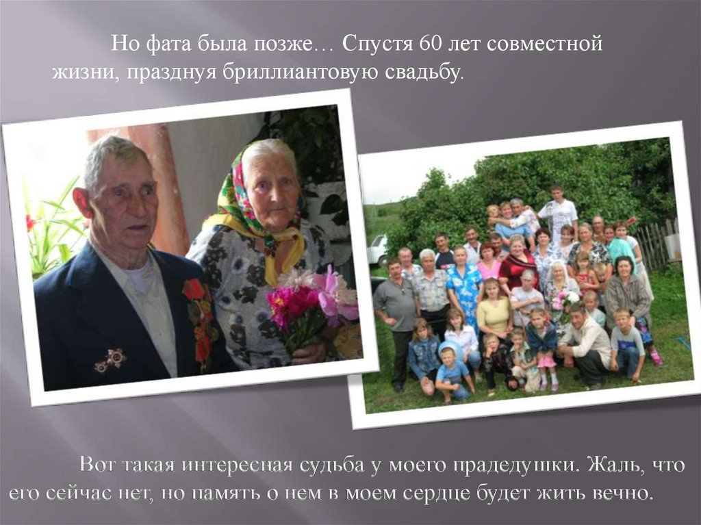 Но фата была позже… Спустя 60 лет совместнойжизни, празднуя бриллиантовую свадьбу.