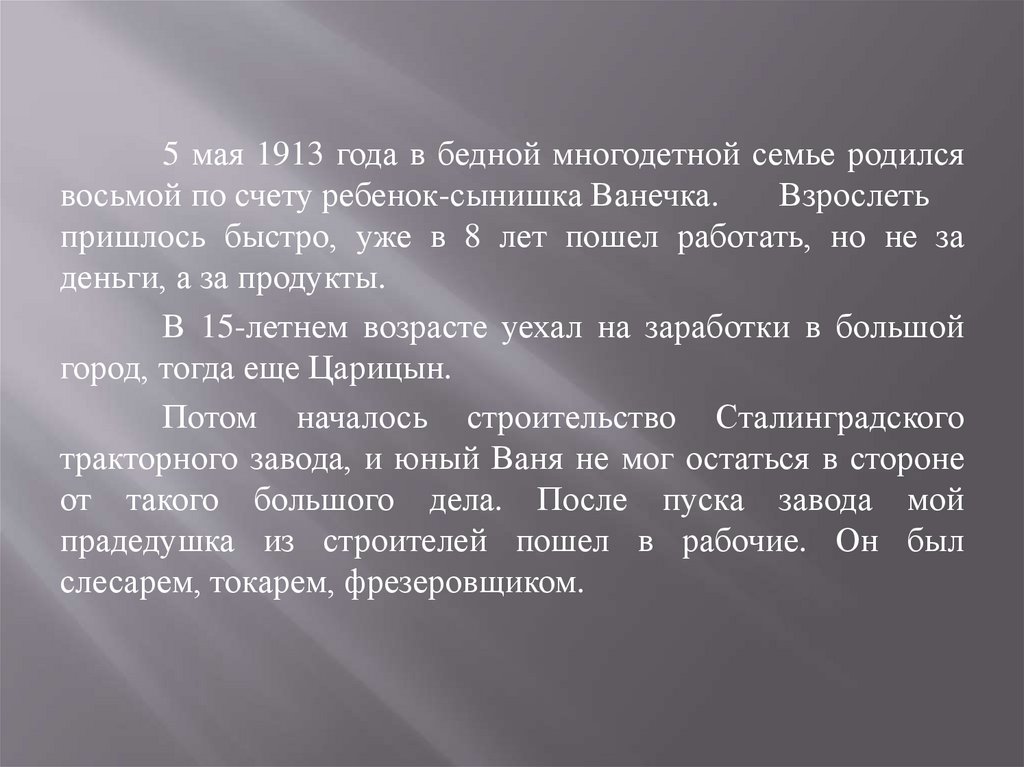 5 мая 1913 года в бедной многодетной семье родилсявосьмой по счету ребенок-сынишка Ванечка.