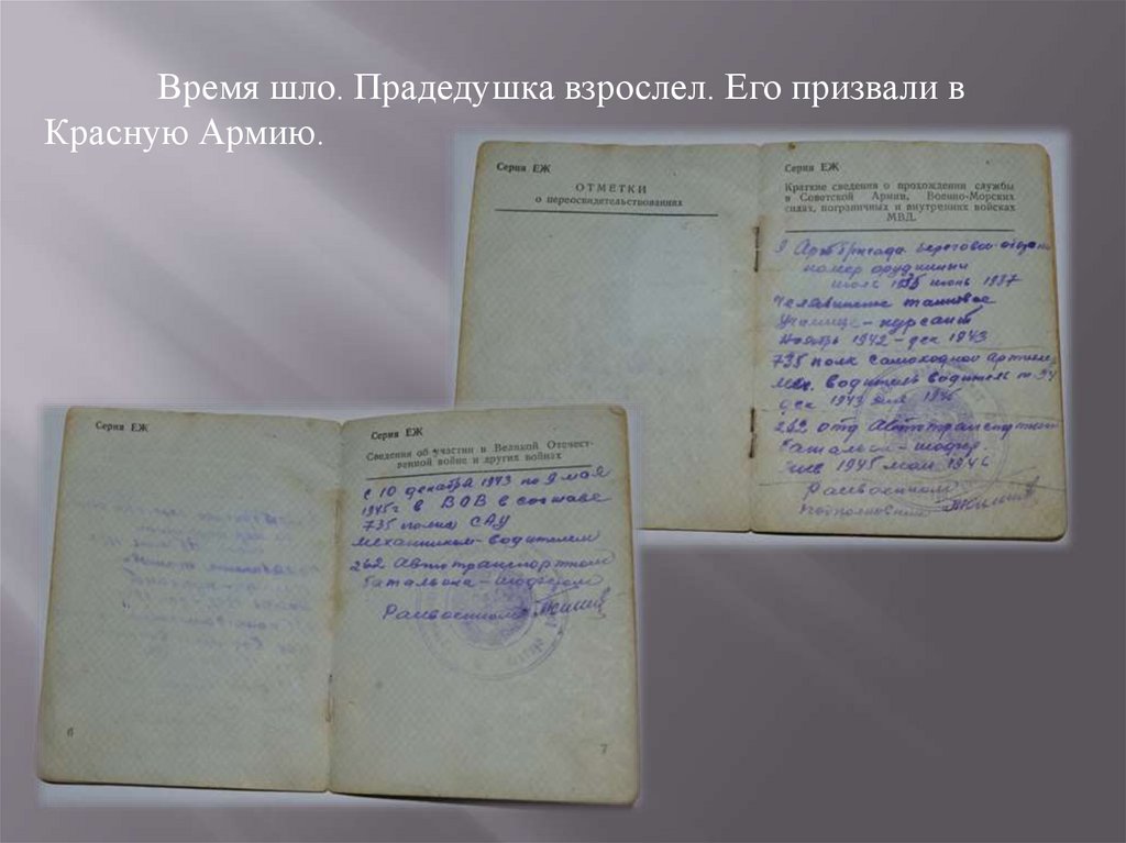 Время шло. Прадедушка взрослел. Его призвали вКрасную Армию.