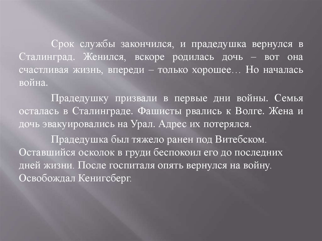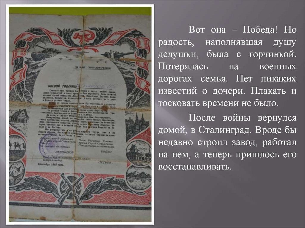 Срок службы закончился, и прадедушка вернулся вСталинград. Женился, вскоре родилась дочь – вот она