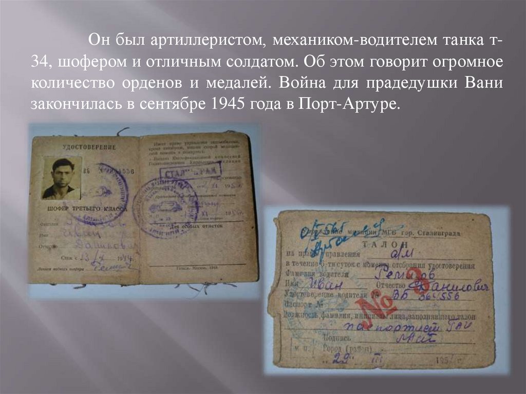 Он был артиллеристом, механиком-водителем танка т34, шофером и отличным солдатом. Об этом говорит огромноеколичество орденов и медалей. Война для прадедушки Вани