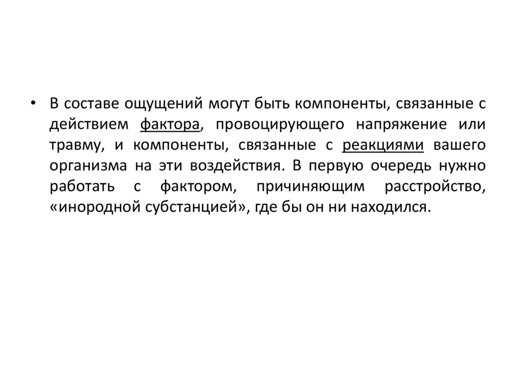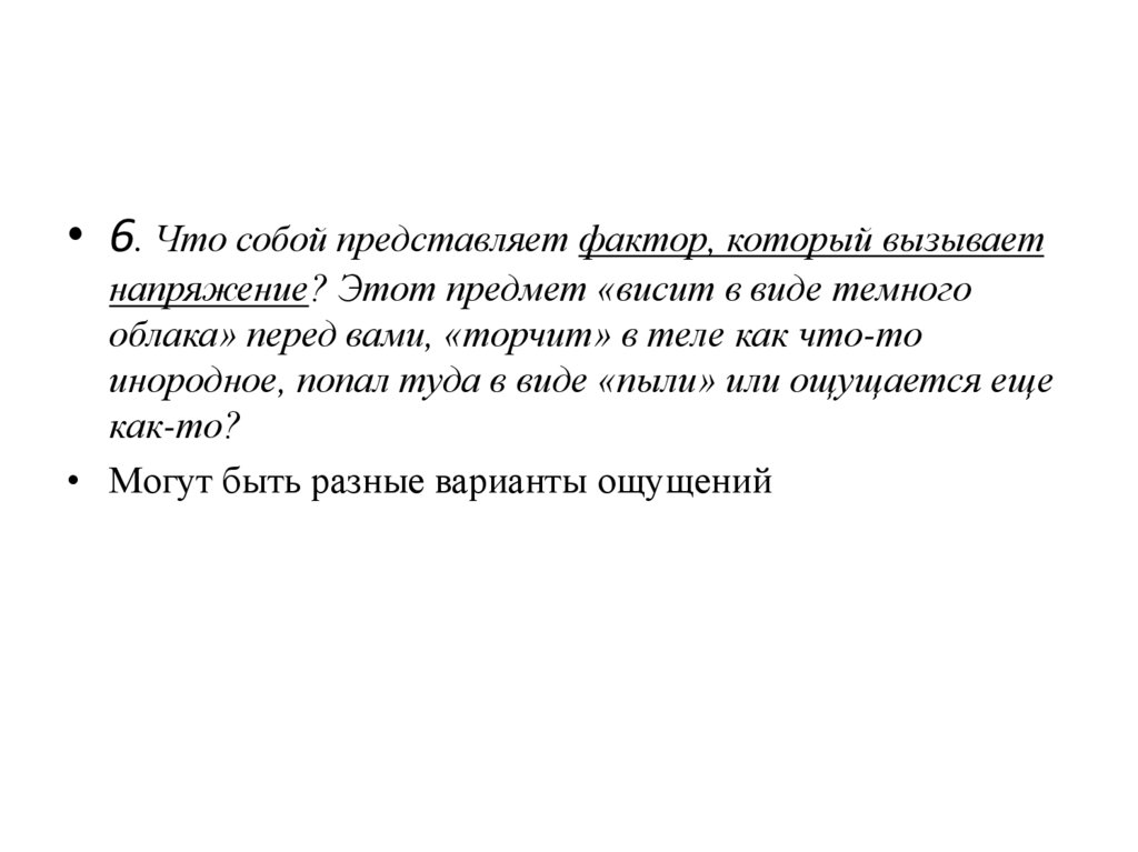 • В составе ощущений могут быть компоненты, связанные сдействием фактора, провоцирующего напряжение или
