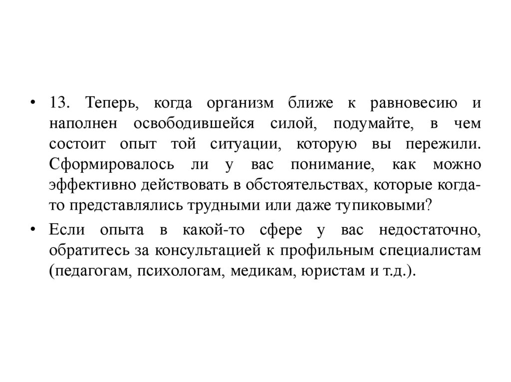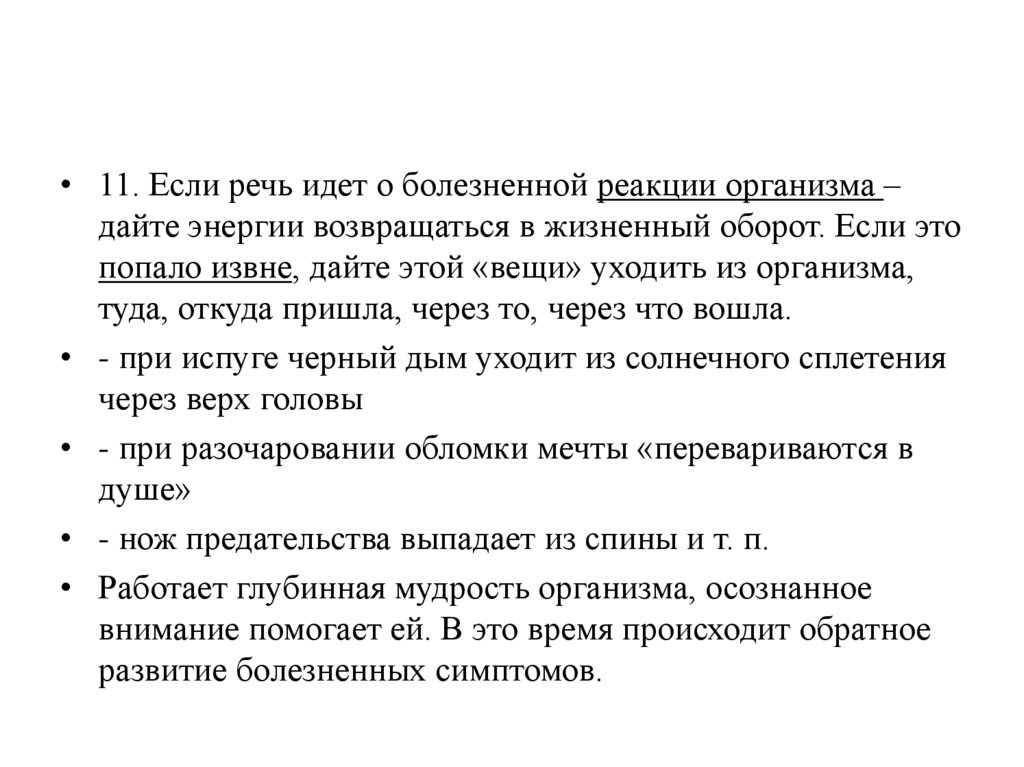 • 11. Если речь идет о болезненной реакции организма –дайте энергии возвращаться в жизненный оборот. Если это