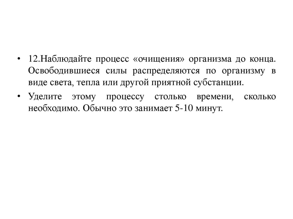 • 12.Наблюдайте процесс «очищения» организма до конца.Освободившиеся силы распределяются по организму в