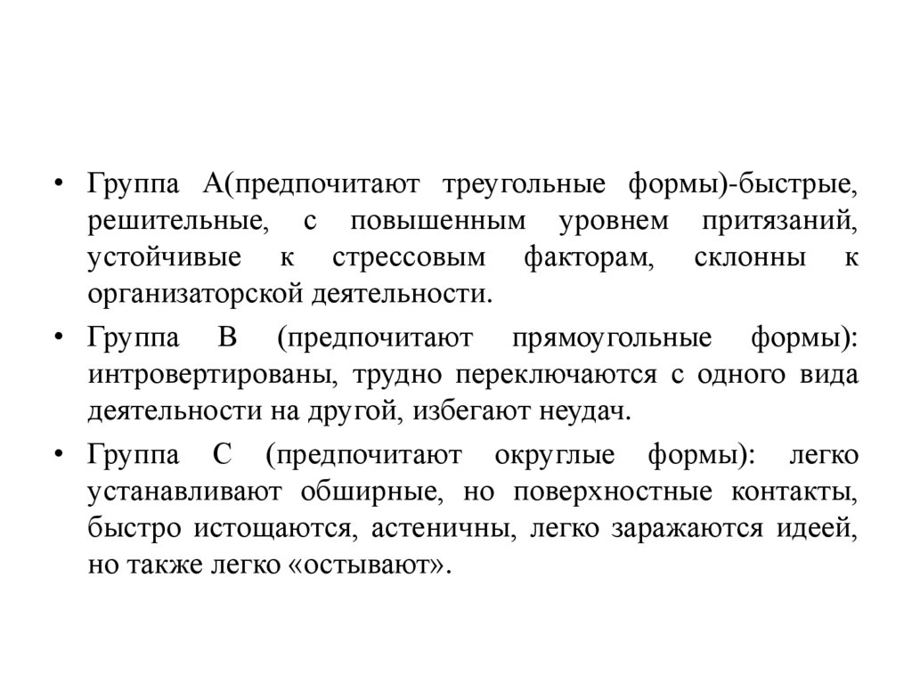 • Группа А(предпочитают треугольные формы)-быстрые,решительные, с повышенным уровнем притязаний,