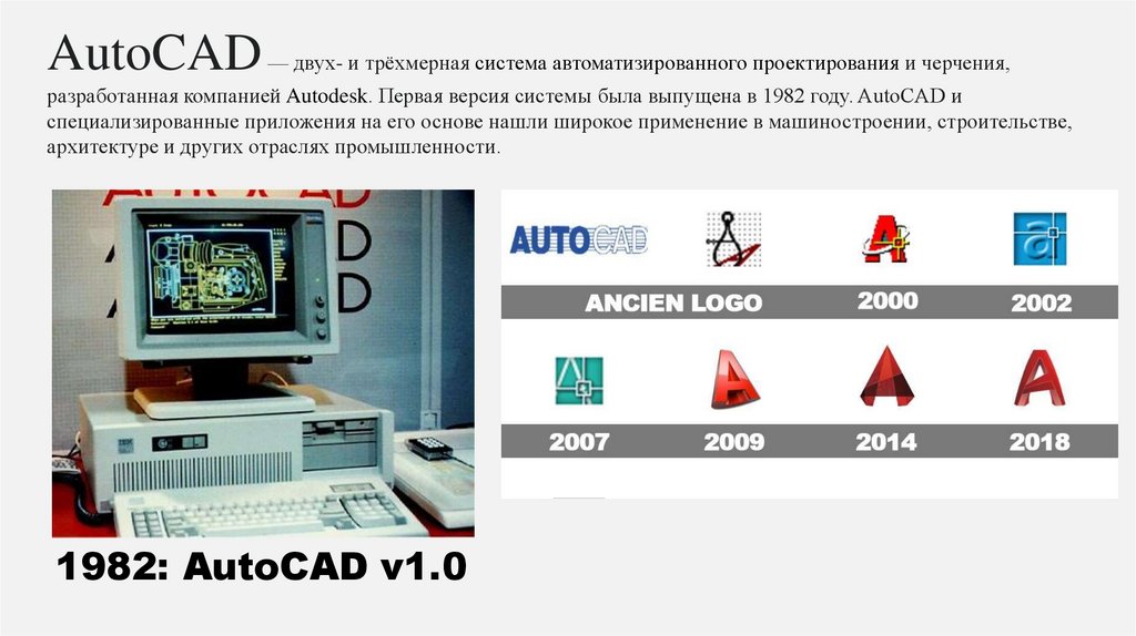 AutoCAD — двух- и трёхмерная система автоматизированного проектирования и черчения,разработанная компанией Autodesk. Первая версия системы была выпущена в 1982 году. AutoCAD и