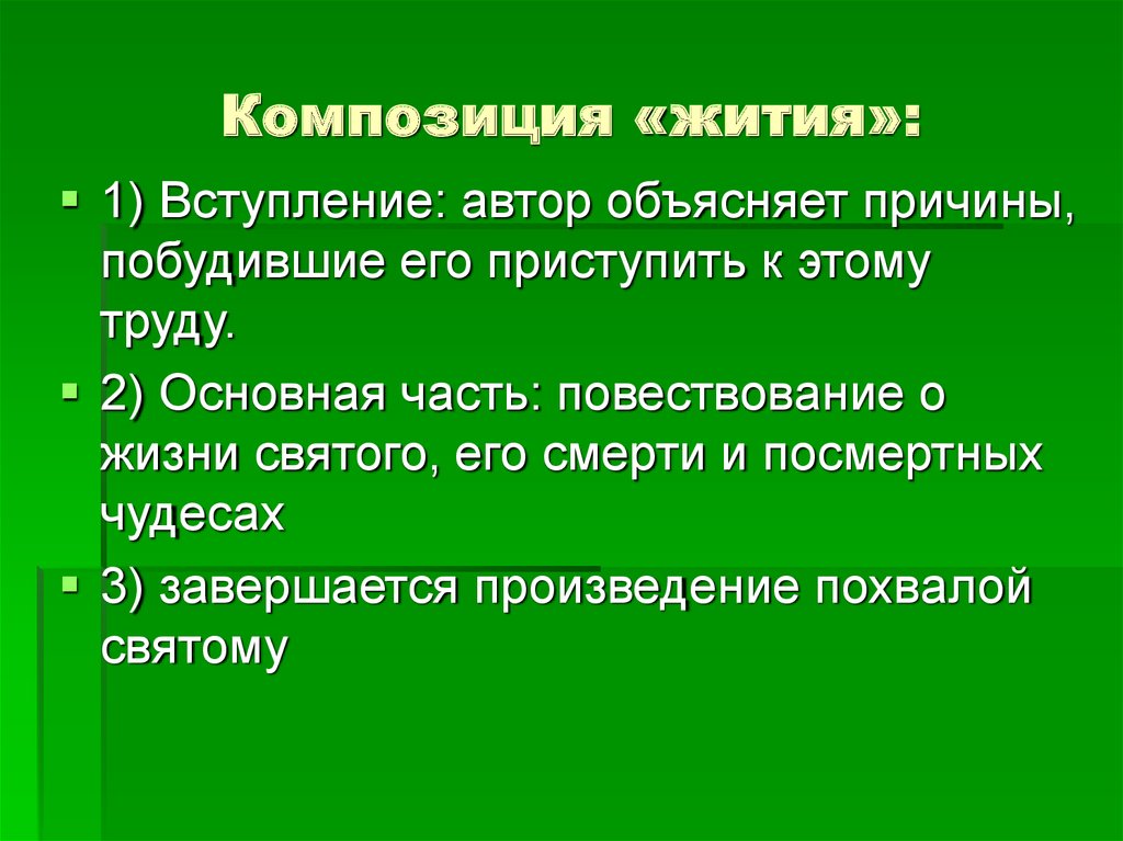Композиция «жития»:1) Вступление: автор объясняет причины,