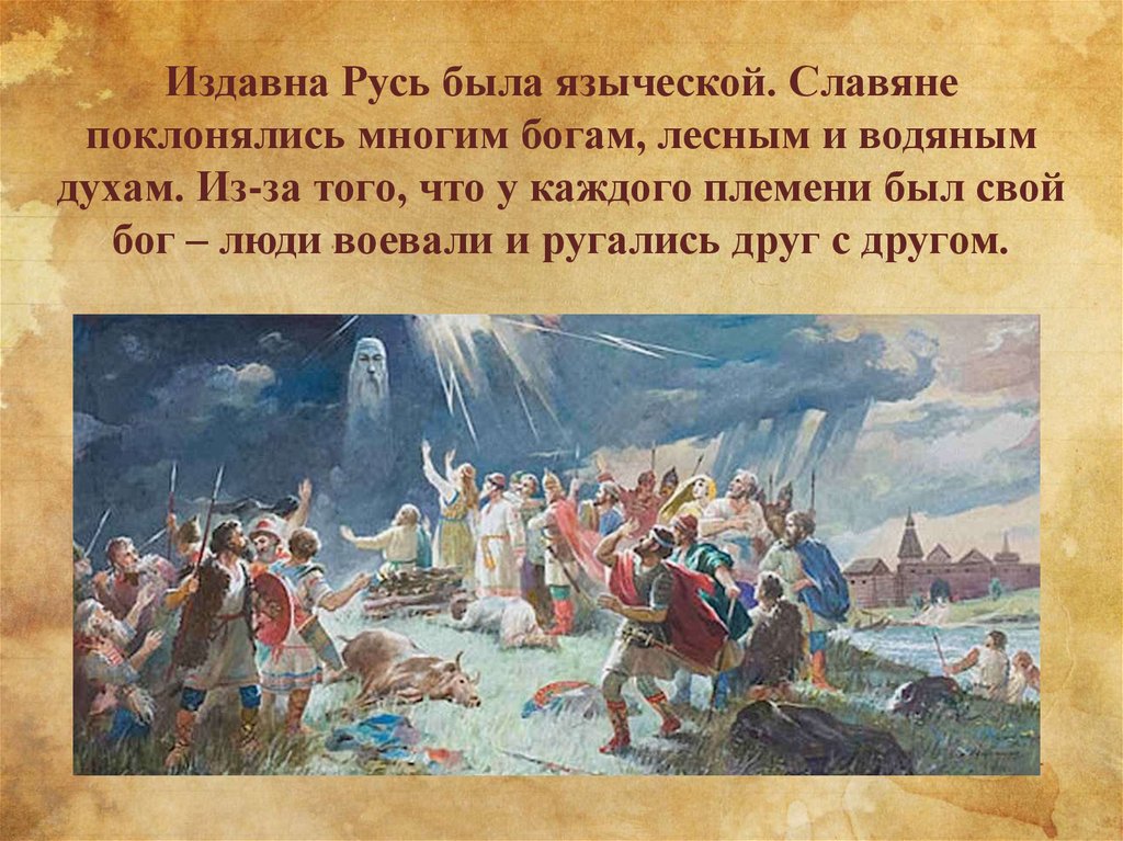 Издавна Русь была языческой. Славянепоклонялись многим богам, лесным и водяным
