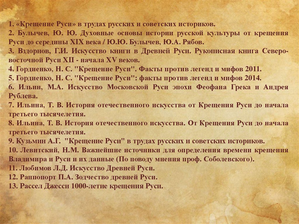 1. «Крещение Руси» в трудах русских и советских историков.2. Булычев, Ю. Ю. Духовные основы истории русской культуры от крещения
