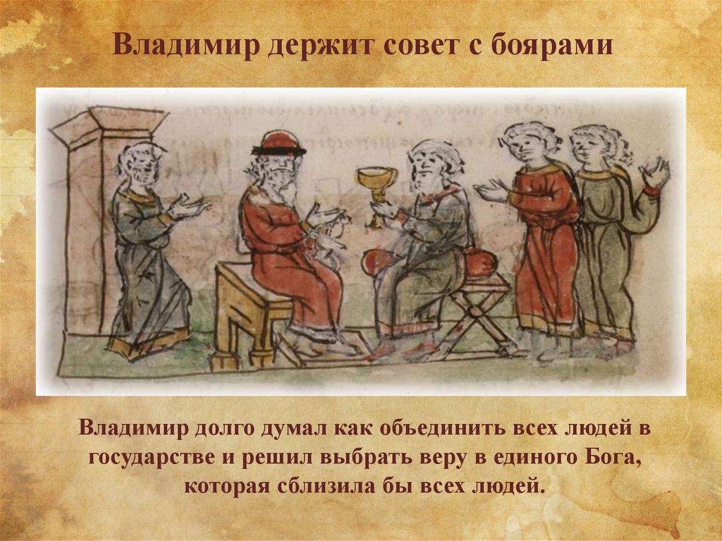 Владимир держит совет с боярамиВладимир долго думал как объединить всех людей в