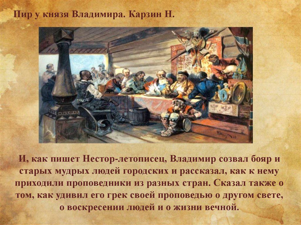 Пир у князя Владимира. Карзин Н.И, как пишет Нестор-летописец, Владимир созвал бояр и