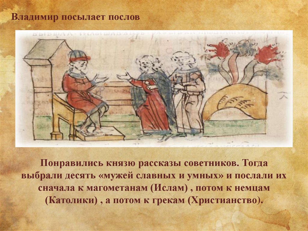 Владимир посылает пословПонравились князю рассказы советников. Тогда