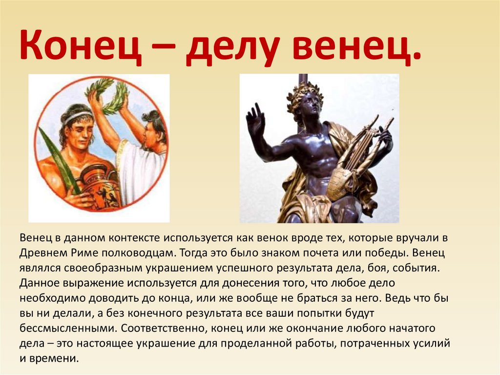 Конец – делу венец.Венец в данном контексте используется как венок вроде тех, которые вручали в