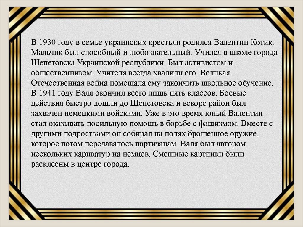 В 1930 году в семье украинских крестьян родился Валентин Котик.Мальчик был способный и любознательный. Учился в школе города