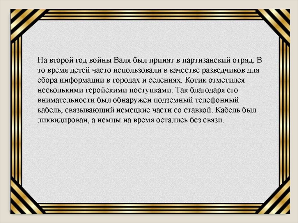 На второй год войны Валя был принят в партизанский отряд. Вто время детей часто использовали в качестве разведчиков для